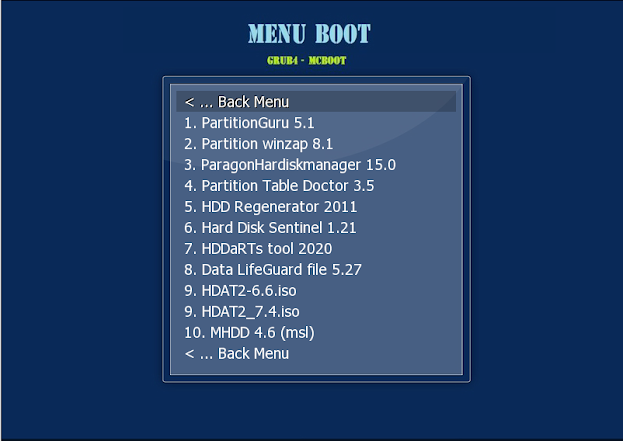 – Boot menu Grub4 for Dos : Boot vào PE Windows, Partition Wizard, Partition Guru, Konboot, Memtest, MHDD, ghost 11.5, HDD regenerator, Active Password Changer … và nhiều công cụ hữu ích khác