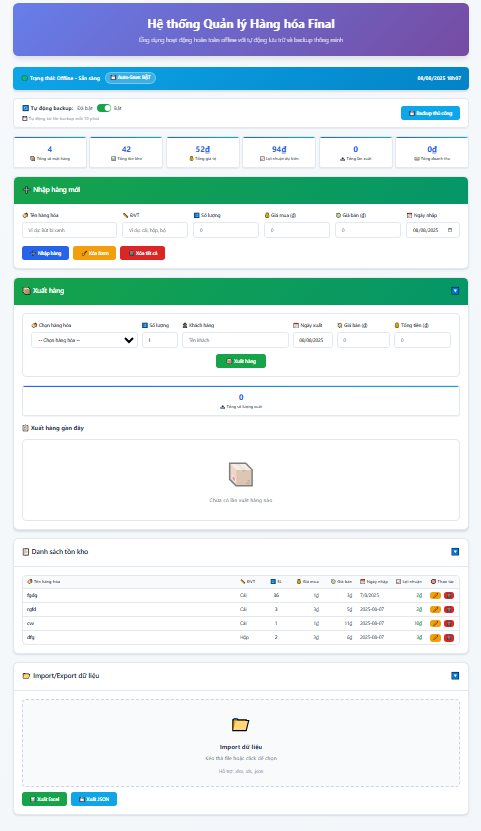 Ứng dụng quản lý kho văn phòng phẩm hoàn toàn offline, được thiết kế cho doanh nghiệp vừa và nhỏ. Hỗ trợ tiếng Việt với giao diện thân thiện, tính năng backup thông minh và khả năng import/export .